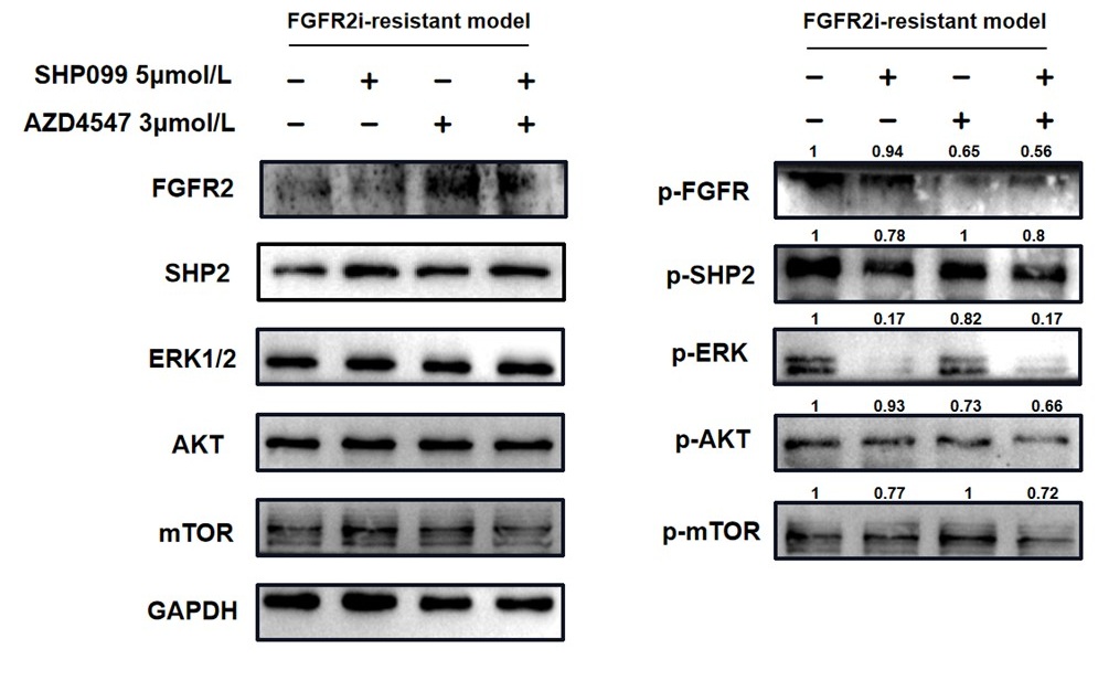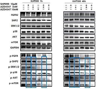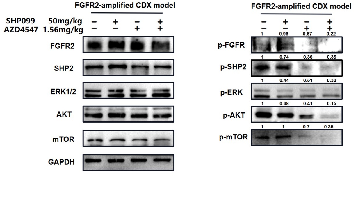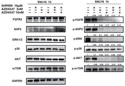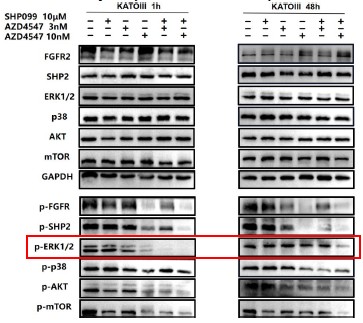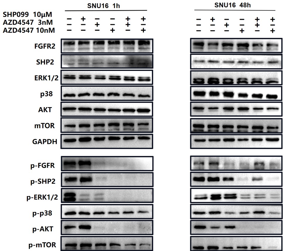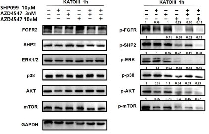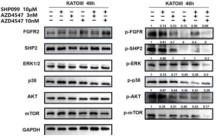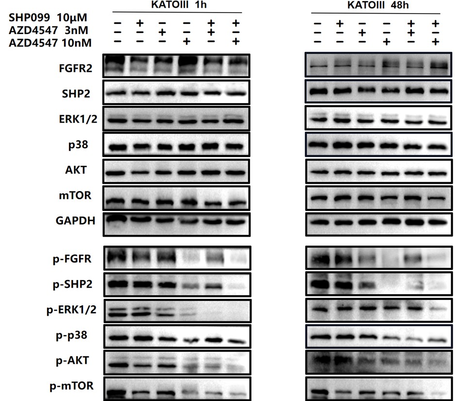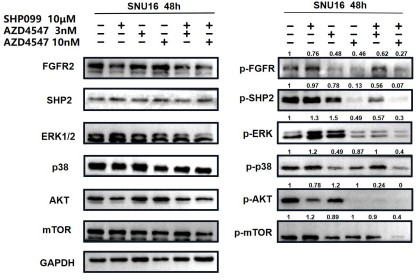 In Fig 2e and 2f, we not only analyzed the synergetic effects of 3 nM (a relatively lower dose) AZD4547 and 10 μm SHP099, but also 10 nM (a relatively higher dose) AZD4547 and 10 μm SHP099. The synergetic effects of different dosage combinations should be compared correctly. From our perspective, the combination treatment led to a stronger inhibition of phospho-FGFR, phospho-SHP2 and FGFR2-initiated downstream signaling molecules, especially in KATOIII.