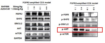 Thank you for the comment. Previous researches have confirmed that both RAS/ERK and PI3K/AKT pathways are two important downstream signaling of FGFR2. In Fig 2E and F, we observed that in FGFR2-amplified cell lines dual blockade had significant inhibitory effects both on p-ERK and p-AKT, and the inhibitory effect on p-ERK is greater than that on p-AKT. Similarly, in Fig 3G, dual blockade mainly suppressed p-ERK, and slightly inhibited p-AKT and p-mTOR in cancer cells derived from the individual patient. Thus, in the two types in-vitro models, dual inhibition simultaneously inhibited both RAS/ERK and PI3K/AKT pathways, and primarily inhibited RAS/ERK pathway, which is not contradictory.