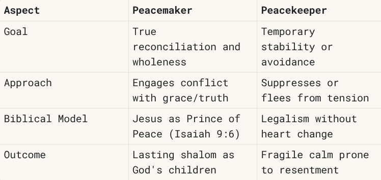 From a biblical perspective, peacemakers actively pursue reconciliation and righteousness as children of God (Matthew 5:9), while peacekeepers merely avoid or suppress conflict to maintain superficial calm.