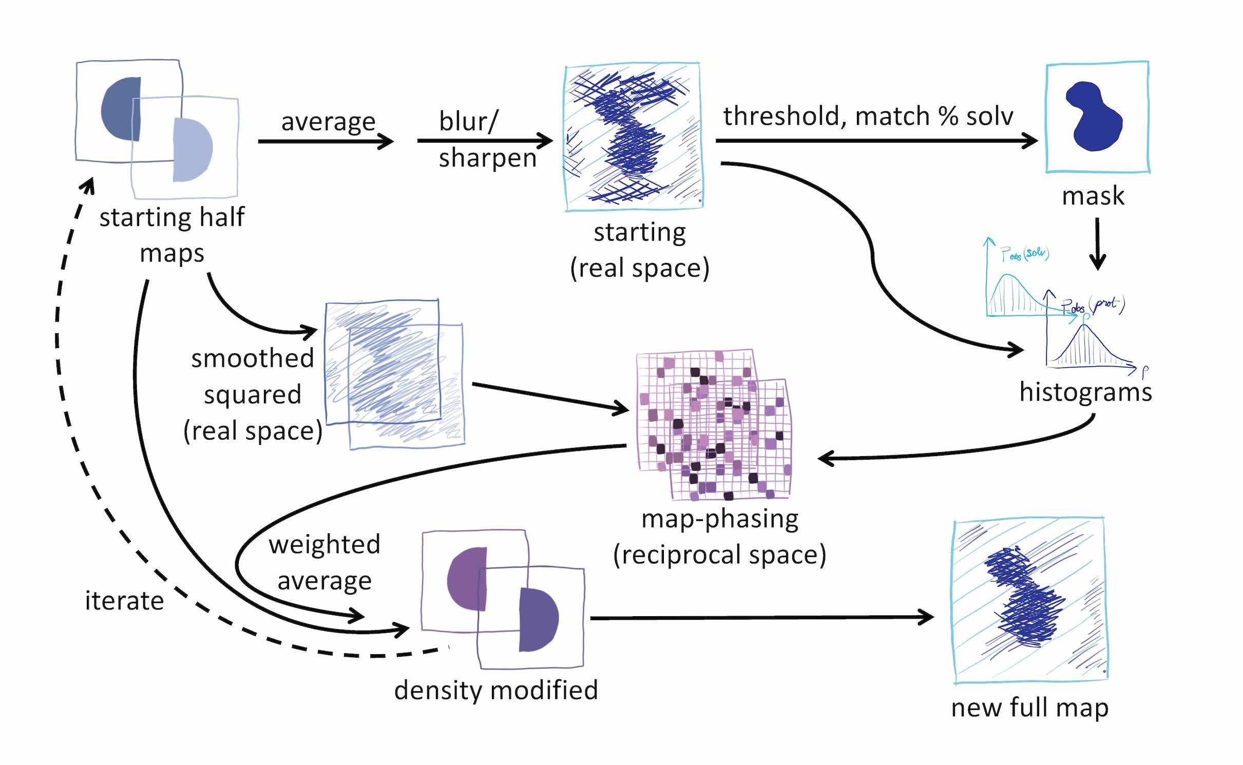 Perhaps most importantly, it was not clear to us that F2, referred to at several points as a density-modified map, is the same as the map-phasing map and that G is the first recombined density-modified map. This could be clarified either in words or by a different choice of variable names. The description of a weighted averaging step could directly reference equation 7a. It would also be helpful to clearly state which steps take place in real space vs. reciprocal space and by individual structure factors or in shells of resolution, or to indicate these in a diagram or flow chart.